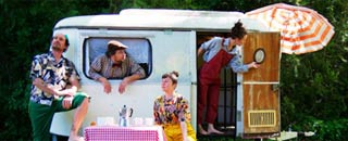Eine Objektmanipulatorin, ein Jongleur, eine Akrobatin, eine Clownin, ein Musiker und ein Wohnwagen. Das Auto?